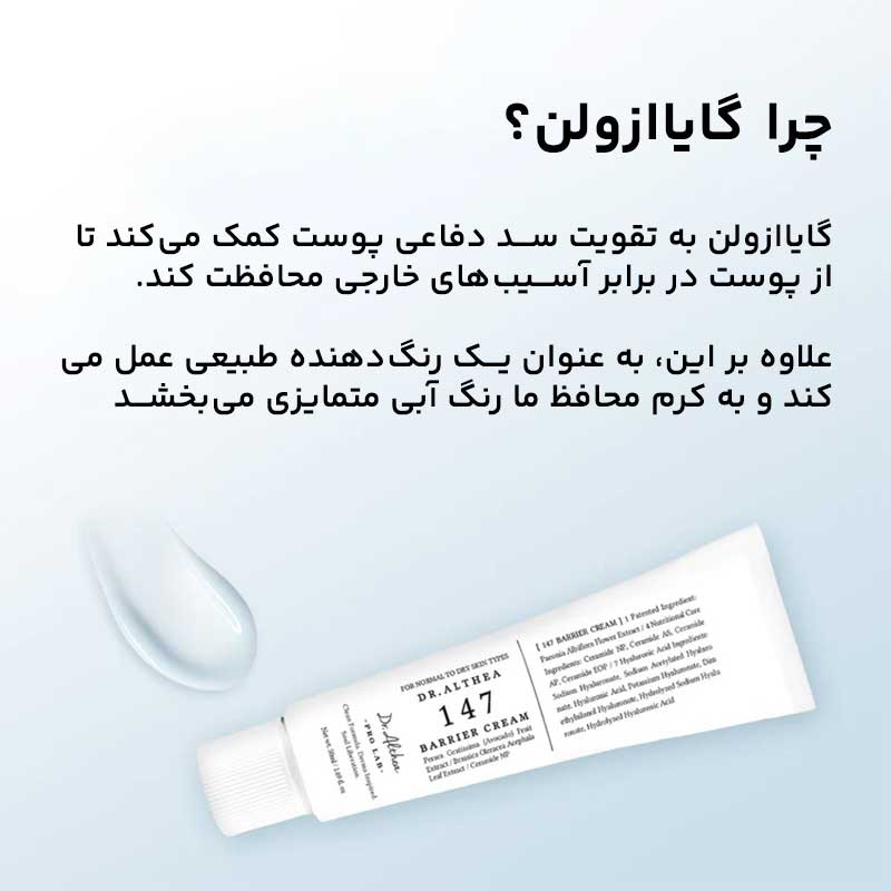 وجود گایاازولن یکی از ویژگیهای کلیدی کرم بریر 147 دکتر التیا است؛ این ترکیب بهطور طبیعی در اسانسهای گیاهی یافت میشود و علاوه بر این که به عنوان رنگدانه آبی در کرم ظاهر میشود، دارای خواص ضدالتهابی و آنتیاکسیدانی است که میتواند قرمزی، سوزش و التهاب پوست را کاهش داده و به تقویت سد دفاعی کمک کند.